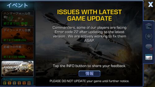 最新のアプデをインストールすると、戦闘中又は世界地図攻略中にコード22が起きてホーム画面に戻るバグが発生しています。 現在運営は修正アプデを検討しているようで、最新のアプデは控えるよう告知しています。 私の同盟のメンバーだけでなく、海外のユー…